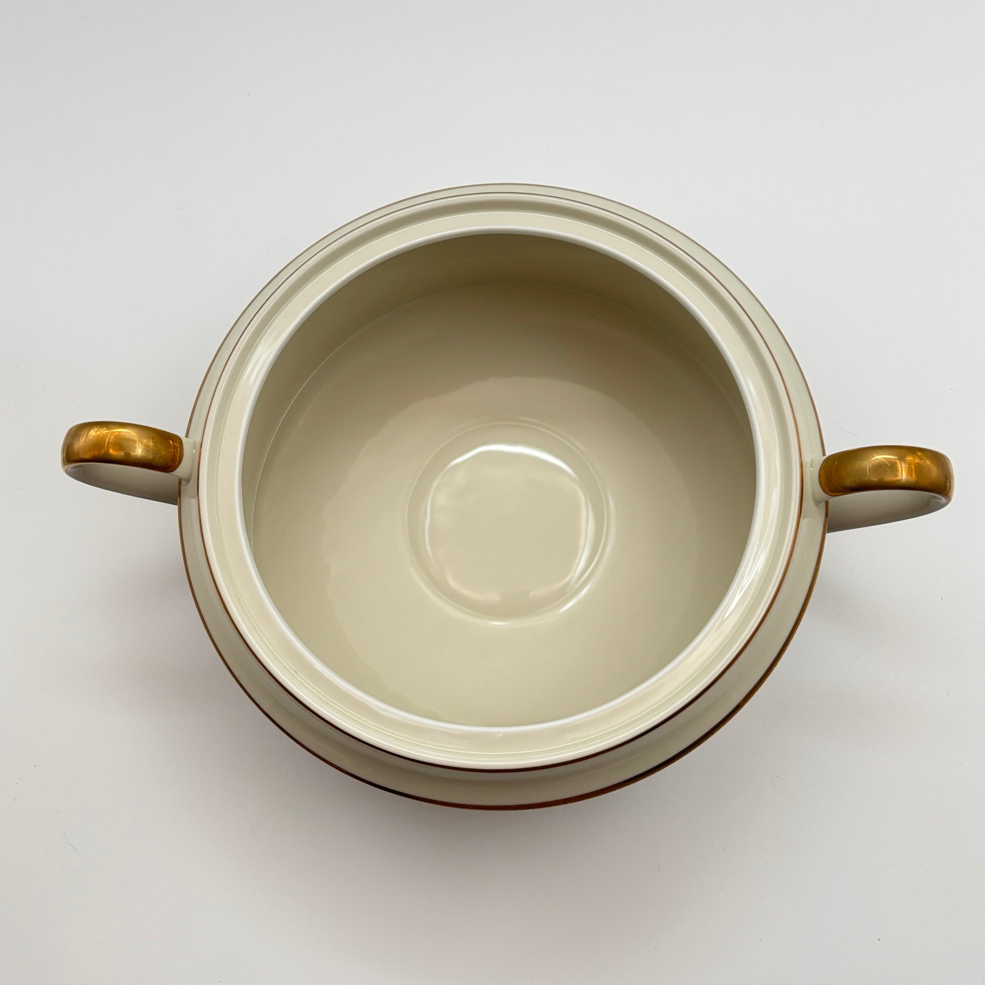 The covered pot is in very good condition, no chips, cracks or crazing. The gold encrusted trim is intact. May show slight manufacturing flaws.