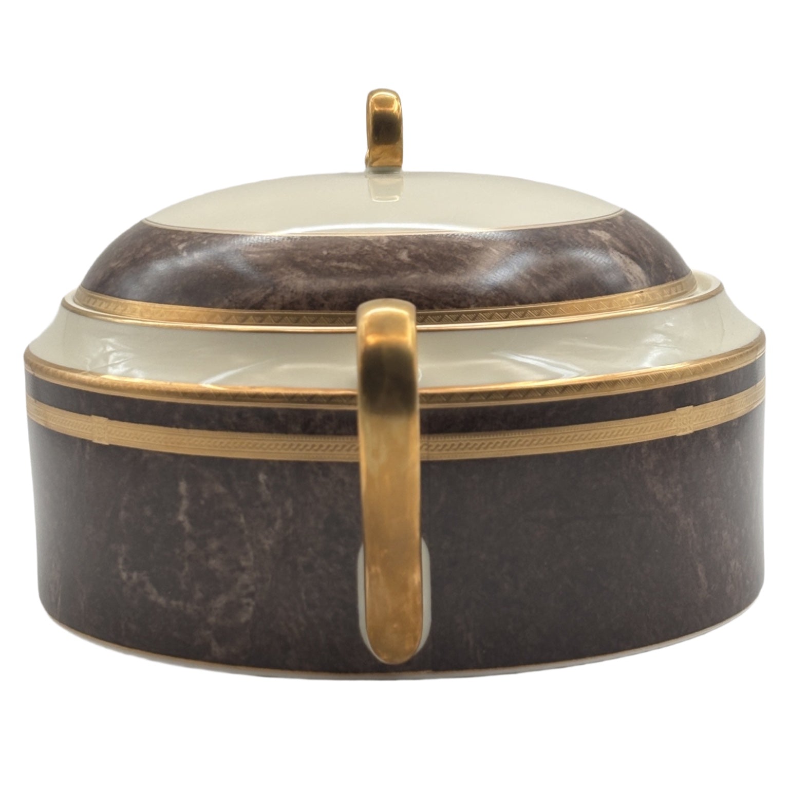 Elevate your dining experience with this exquisite 2.25 Qt two handle Round Covered Casserole Pot from Mikasa's discontinued Mahogany Florentine collection, renowned for its timeless sophistication and rich detailing. The covered pot showcases a luxurious gold-encrusted band paired with a brown marble rim, creating a warm, regal aesthetic that complements both formal and casual settings.
