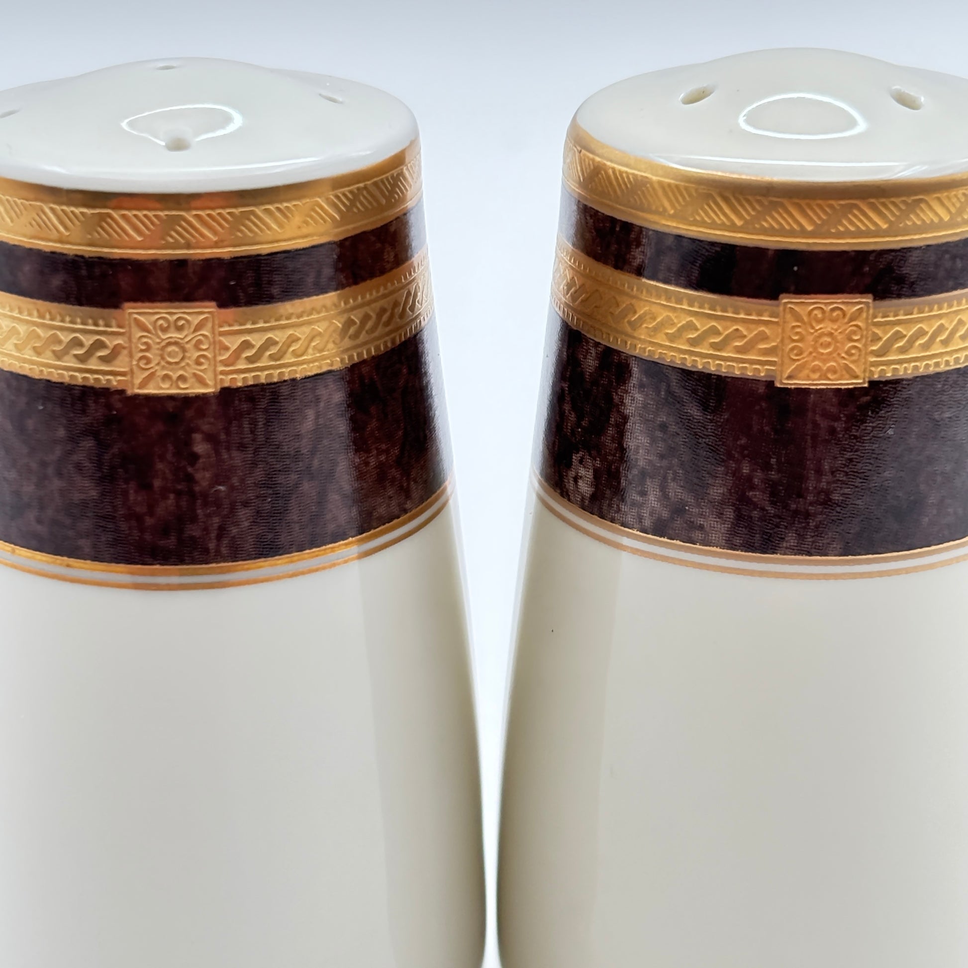 The Mikasa Fine China L2222 Mahogany Florentine Salt & Pepper set is a discontinued and collectible pattern that was produced in Japan around 1999–2000