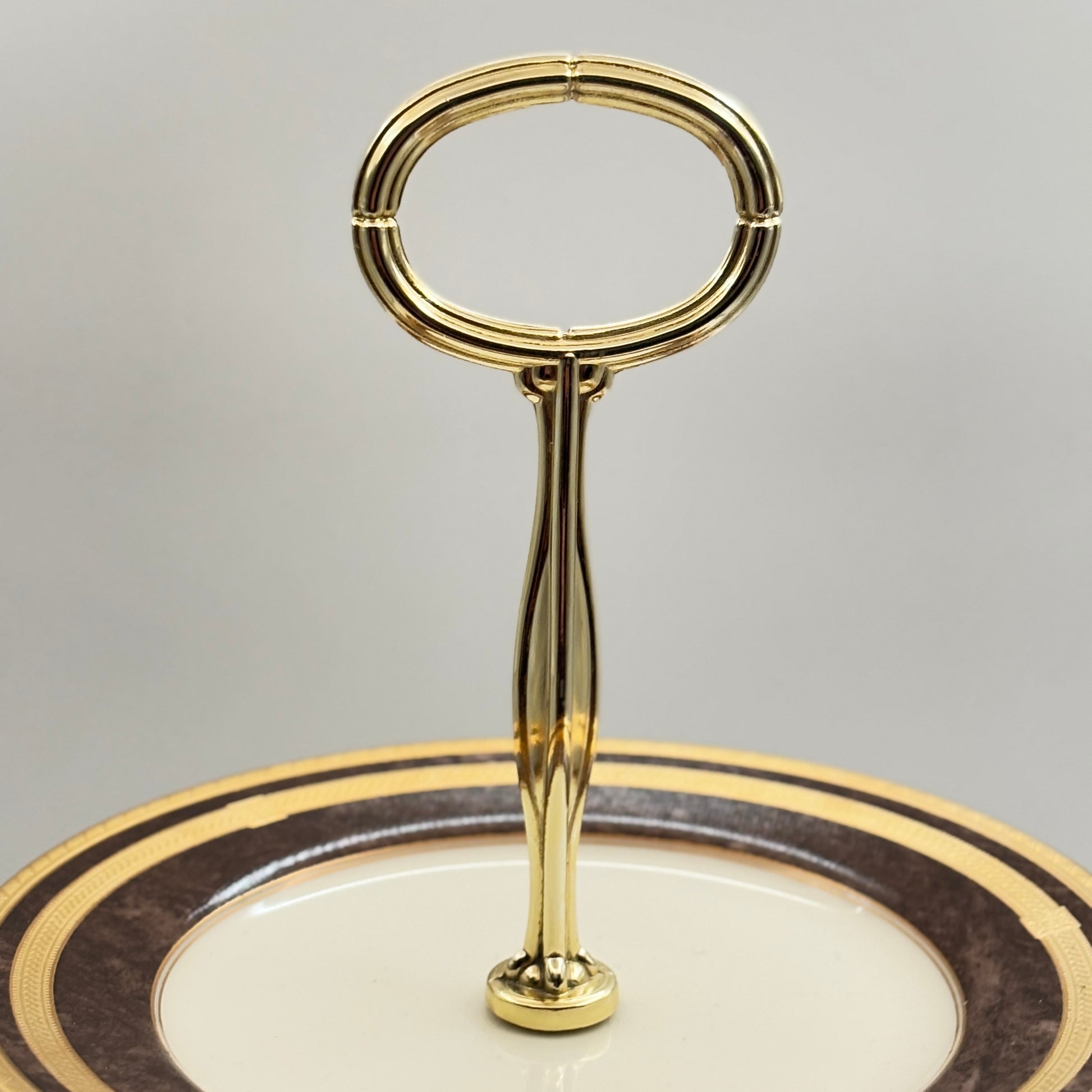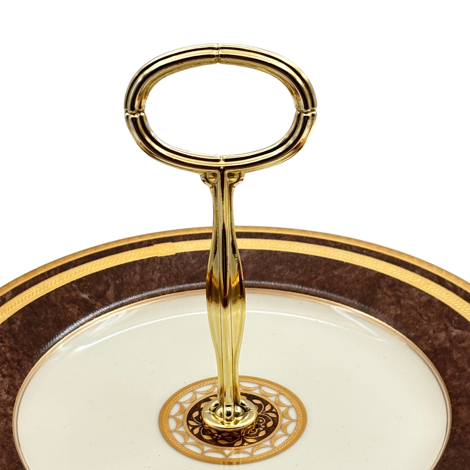 The 2-tier cake plate is in very good condition, no chips, cracks or crazing. Gold encrusted trim is intact. May show slight manufacturing flaws.
