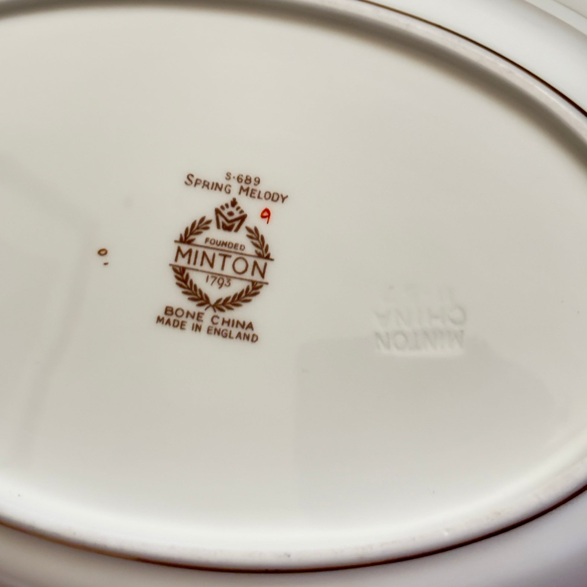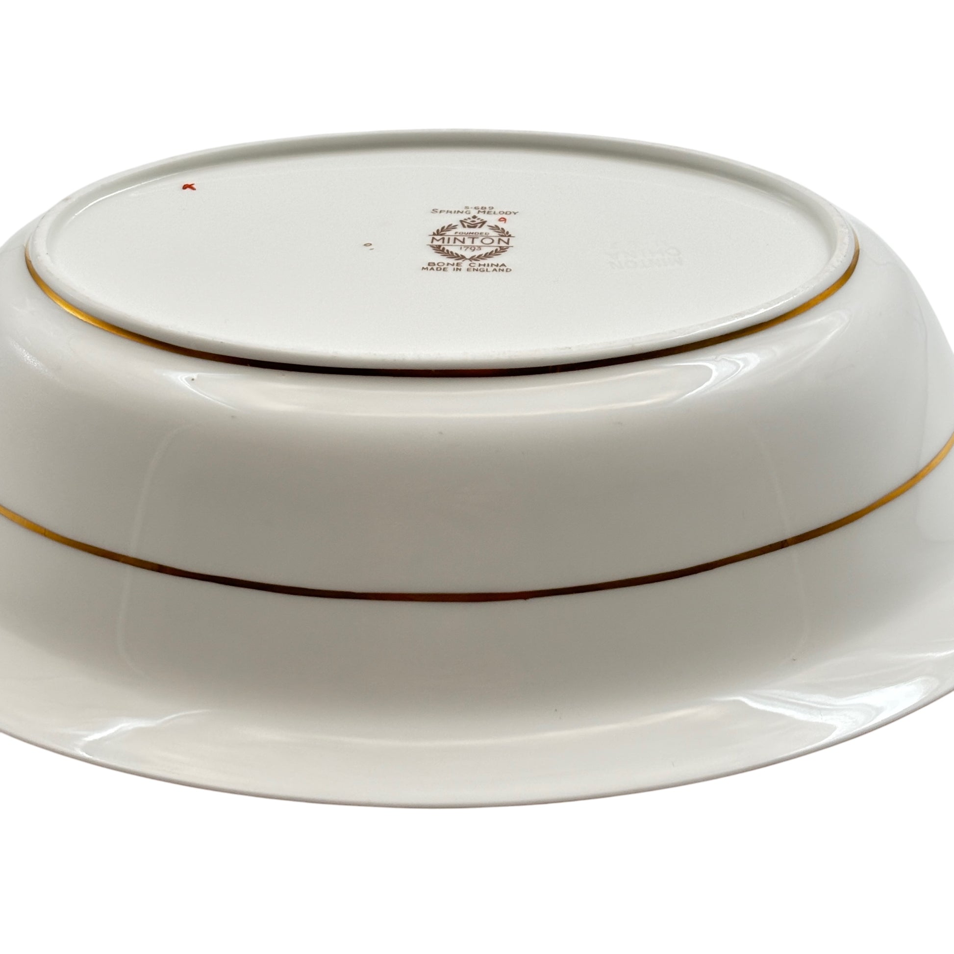 Made of fine bone china, the bowl’s translucent white base glows with understated luxury. Whether used for serving or simply admired as a standalone piece, it evokes a sense of nostalgia and domestic grace. The underside bears the original Minton mark and pattern code, affirming its heritage.