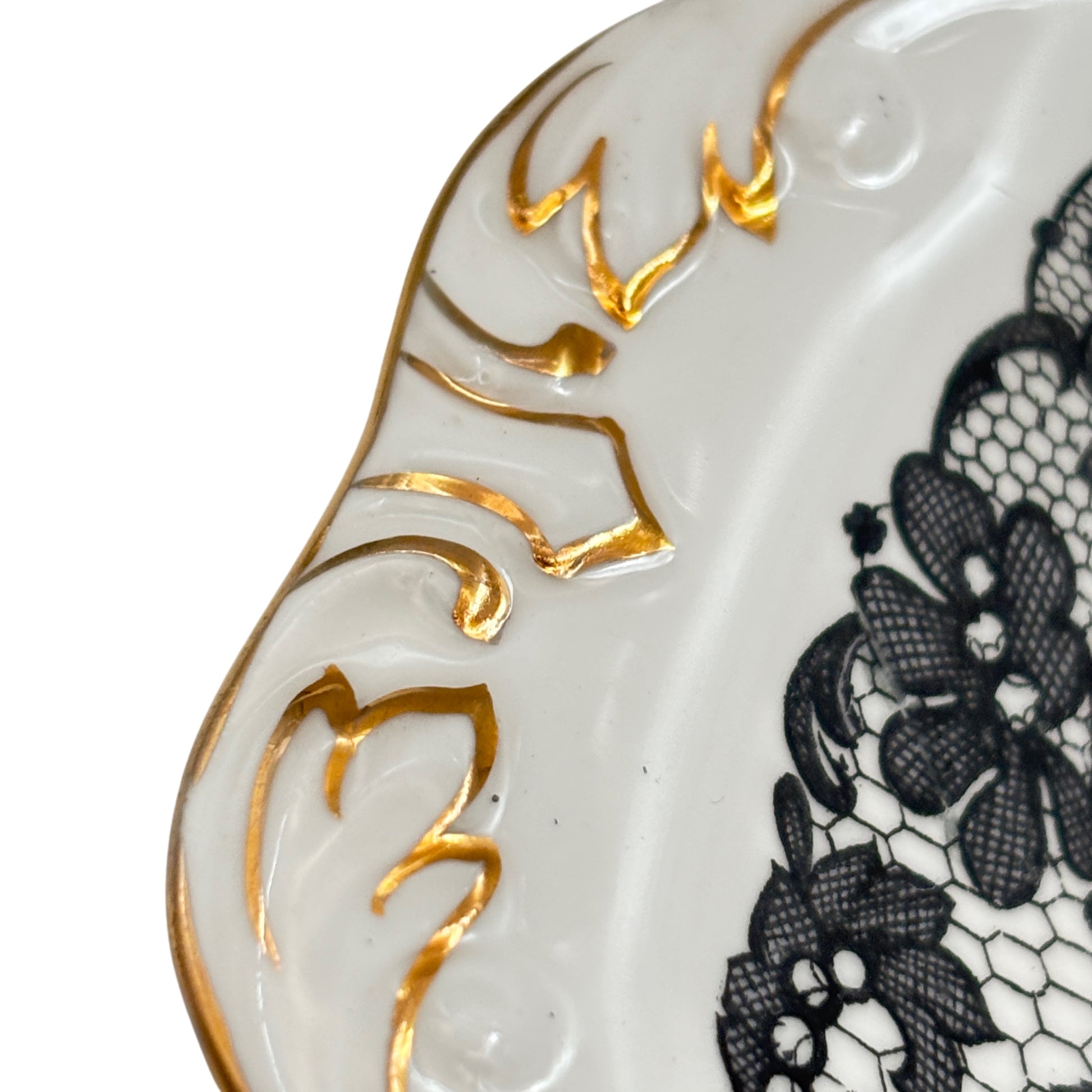 Add a touch of vintage drama to your table with this exquisite Royal Albert “Senorita” cake plate, crafted in England during the 1950s. Featuring vivid pink rose and dark green foliage and black lace, the design dances across white bone china with elegance and flair. Twin handles and scalloped edges trimmed in 22k gold evoke the silhouette of a flamenco fan—graceful, bold, and unforgettable.