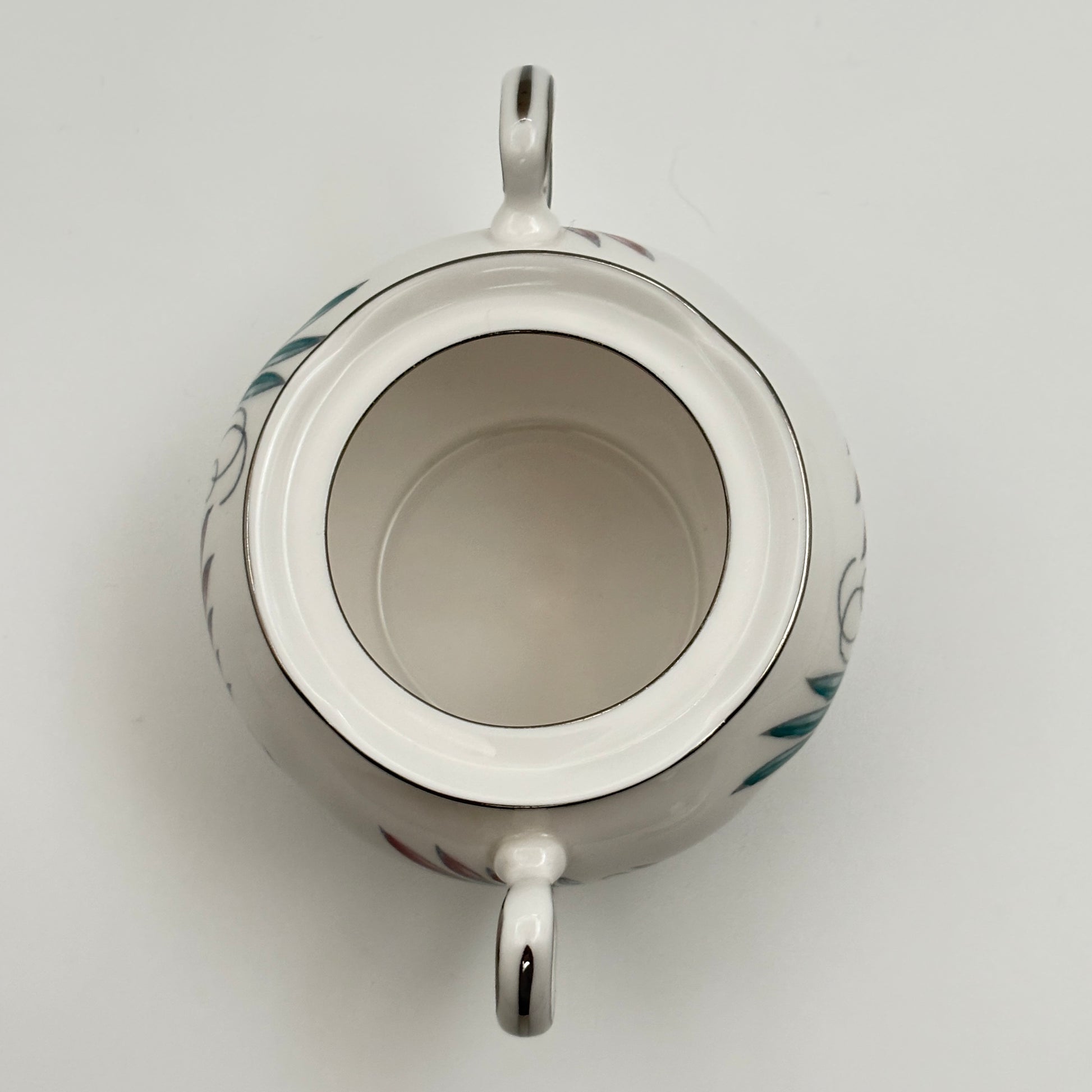 The lidded sugar bowl and cream pitcher are in very good condition, no chips, cracks or crazing. The platinum trim is intact. May show slight manufacturing flaws.