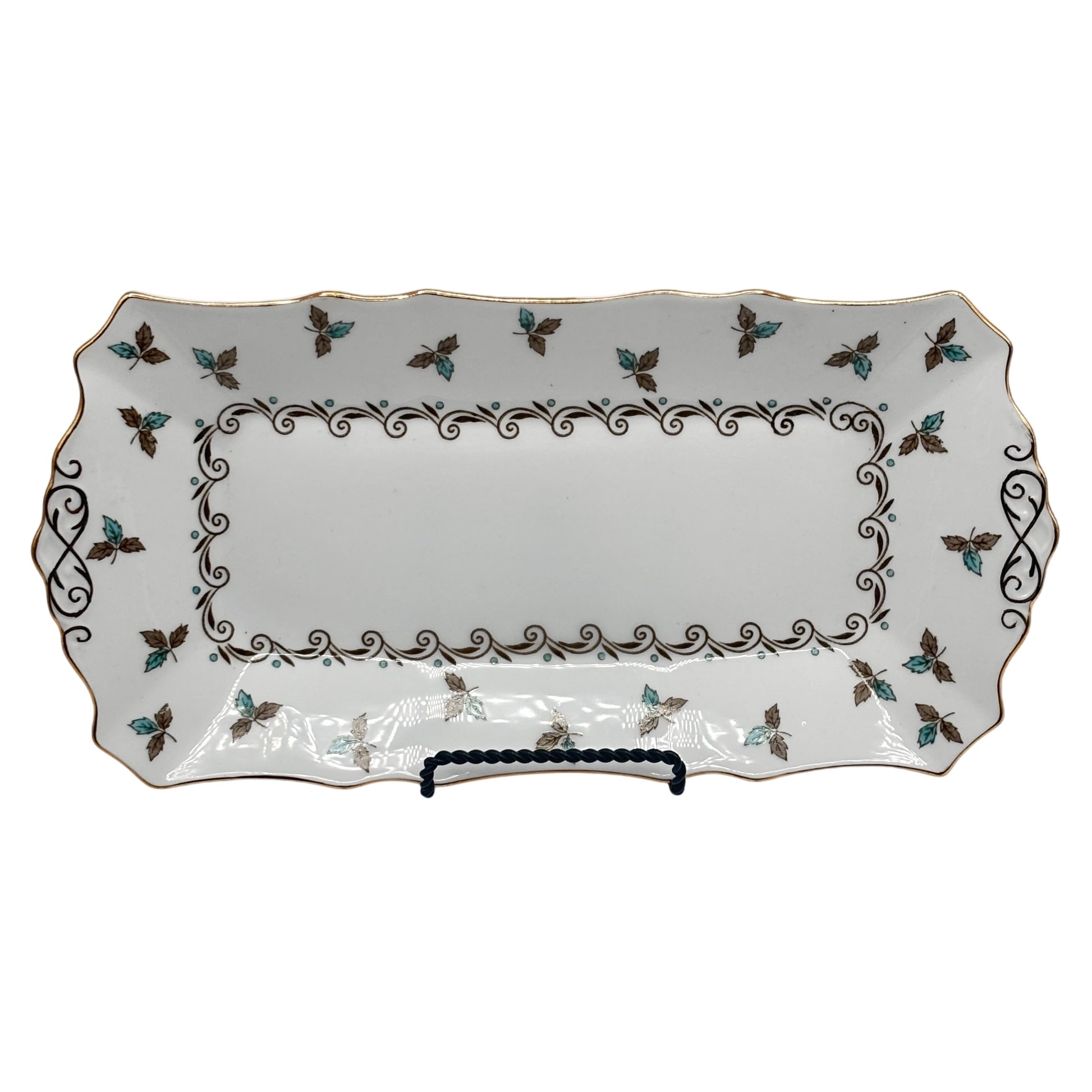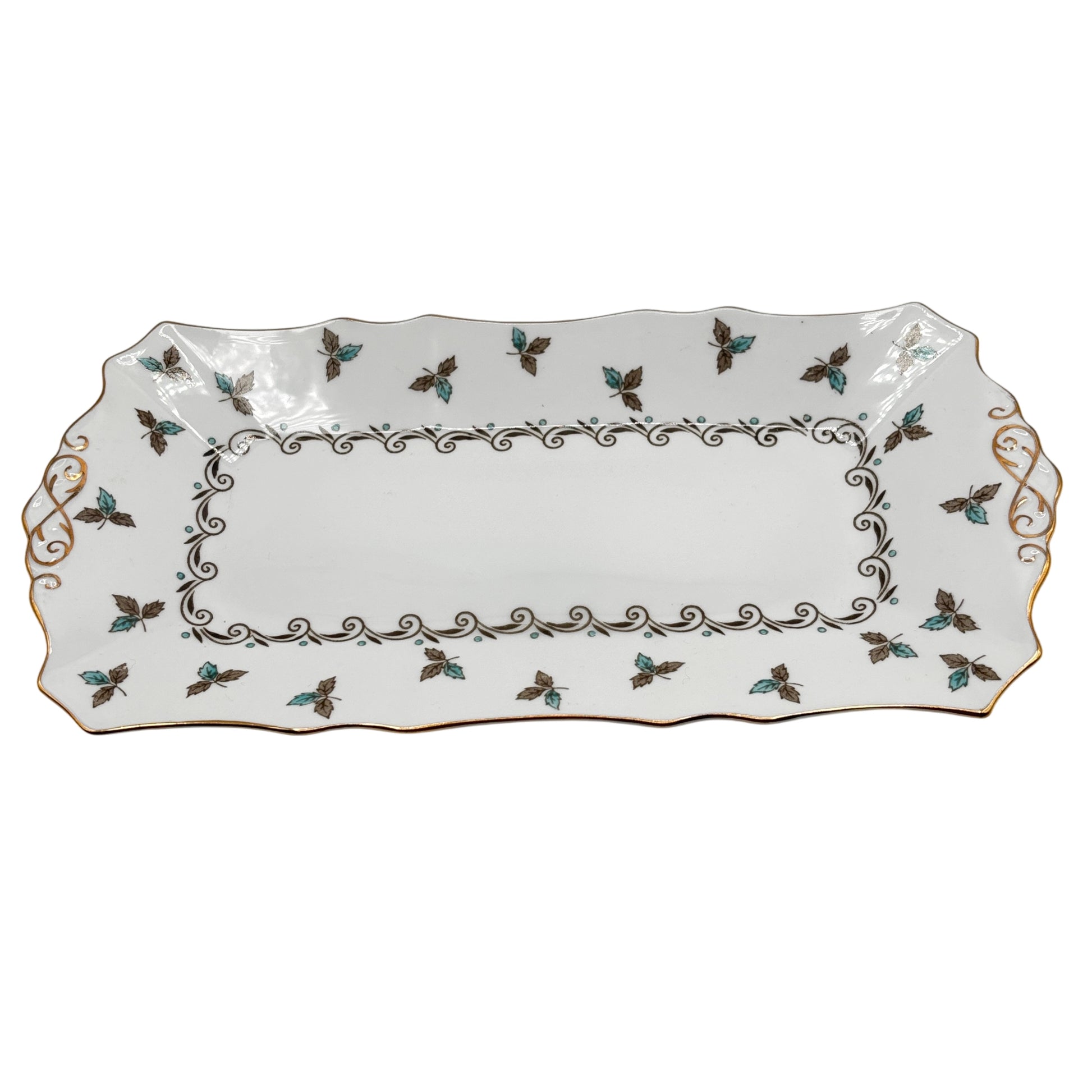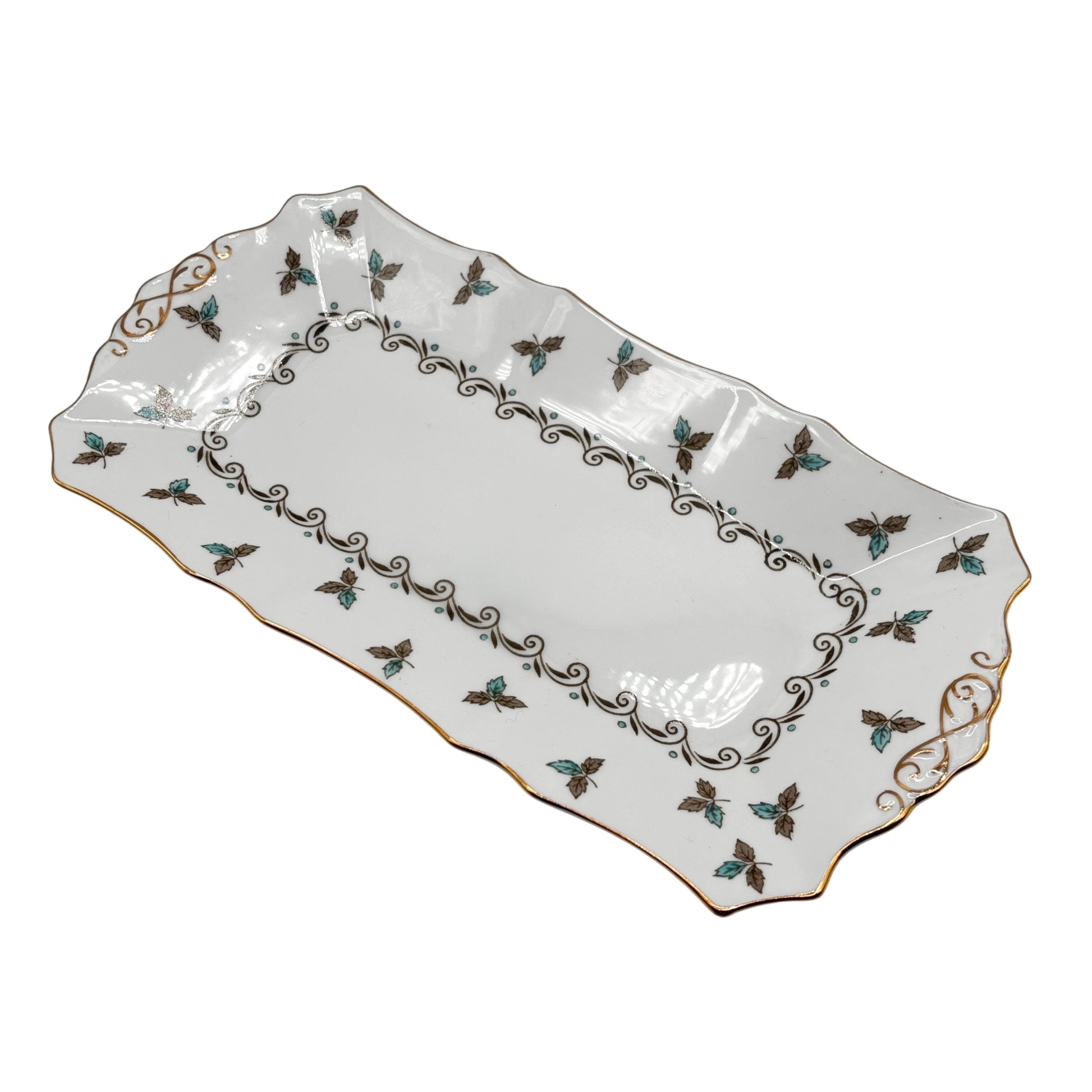 Step into timeless elegance with this exquisite pickle dish crafted by Tuscan Fine English Bone China, proudly made in England. Featuring the beloved Nanette pattern, introduced 1947+, this set captures the romance and refinement of mid-century English tableware. a sophisticated design of brown and turquoise leaves delicately arranged on a crisp white background. The ribbed texture adds graceful dimension, while lustrous gold trim lends a regal finish.