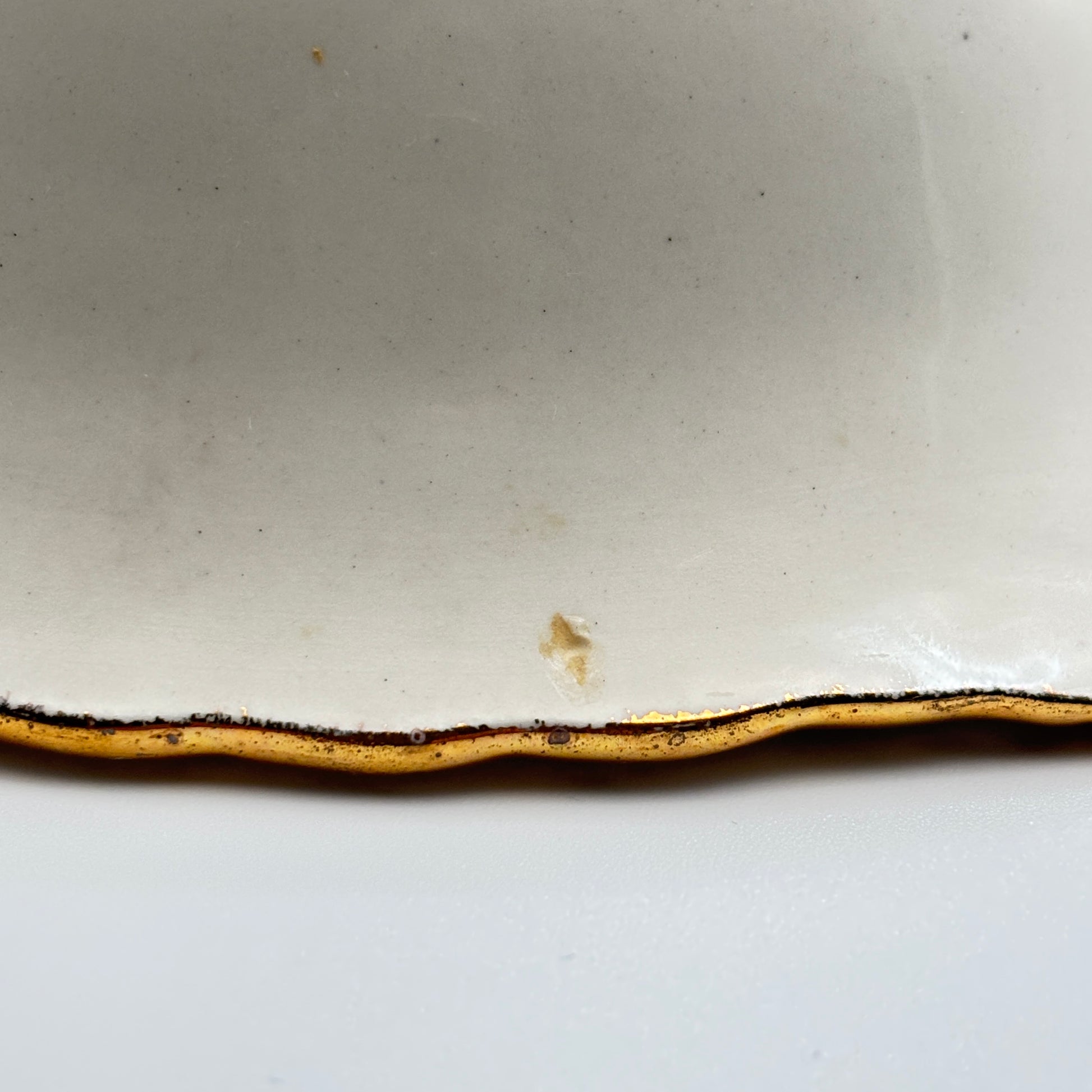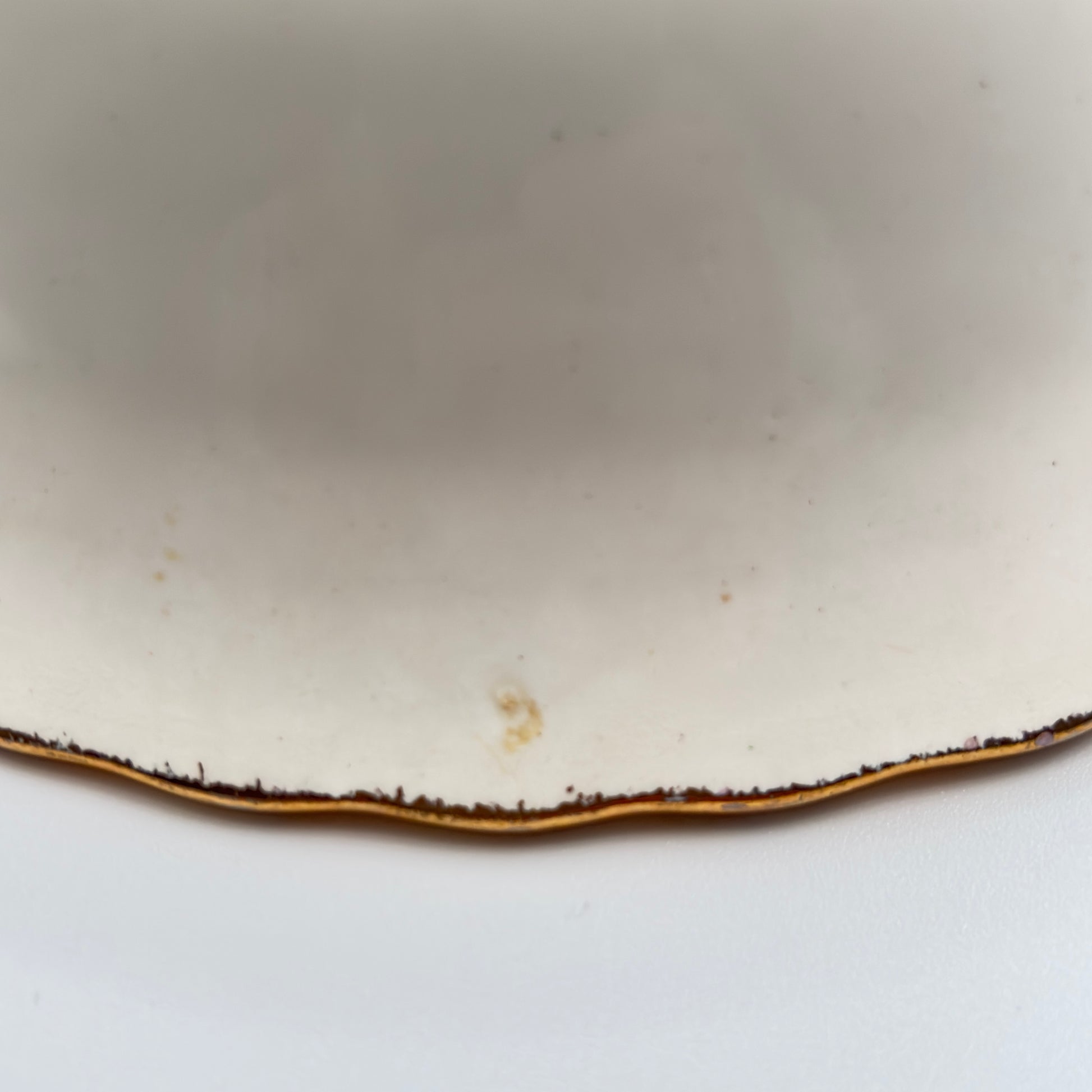 Measuring 2 1/2" high by 9" across, its gently flared silhouette is crowned with a thumbprint rim, generously gilded in rich gold that catches the light with every turn.